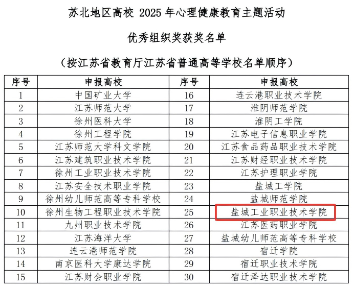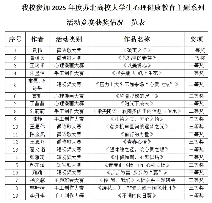 9月19日,江苏省苏北地区大学生心理健康教育研究中心公布了2025年度苏北高校大学生心理健康教育主题系列活动竞赛结果,我校再创佳绩,共获一等奖4项、二等奖5项、三等奖10项,学校也连续第五年荣获“优秀组织奖”。